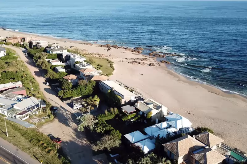 Excepcional casa à beira-mar em Punta Piedras com 25 metros de frente para a praia e acesso direto. No andar superior, encontra-se a suíte master com uma vista clara do oceano, além de outro quarto em suíte voltado para o norte e dependências de serviço completas. No andar térreo, possui 2 quartos com banheiro compartilhado, cozinha, sala de estar, hall, sala de jantar e um banheiro social. Ao sair da sala de estar para o deck do lado sul, você encontrará a piscina com área de churrasco, tudo oferecendo uma ampla panorâmica.